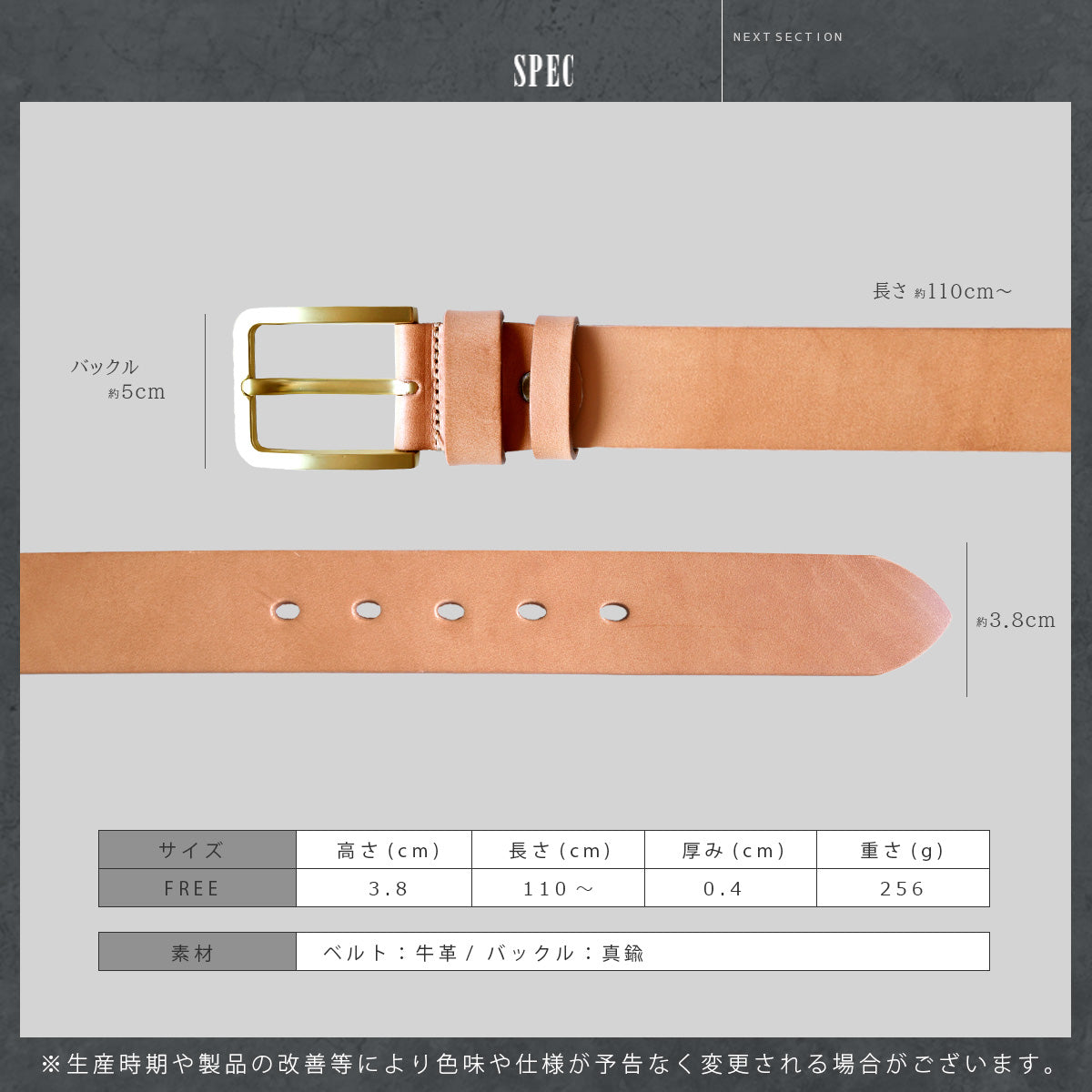 本革の醍醐味であるエイジングが存分に楽しめるナチュラルレザーを使用したレザーベルトです。使えば使うほどに味が出てきます。染色を施していない天然革のヌメ革となりますので表面に染みや小傷などがある場合がありますが使用していくうちに目立たなくなってきます。