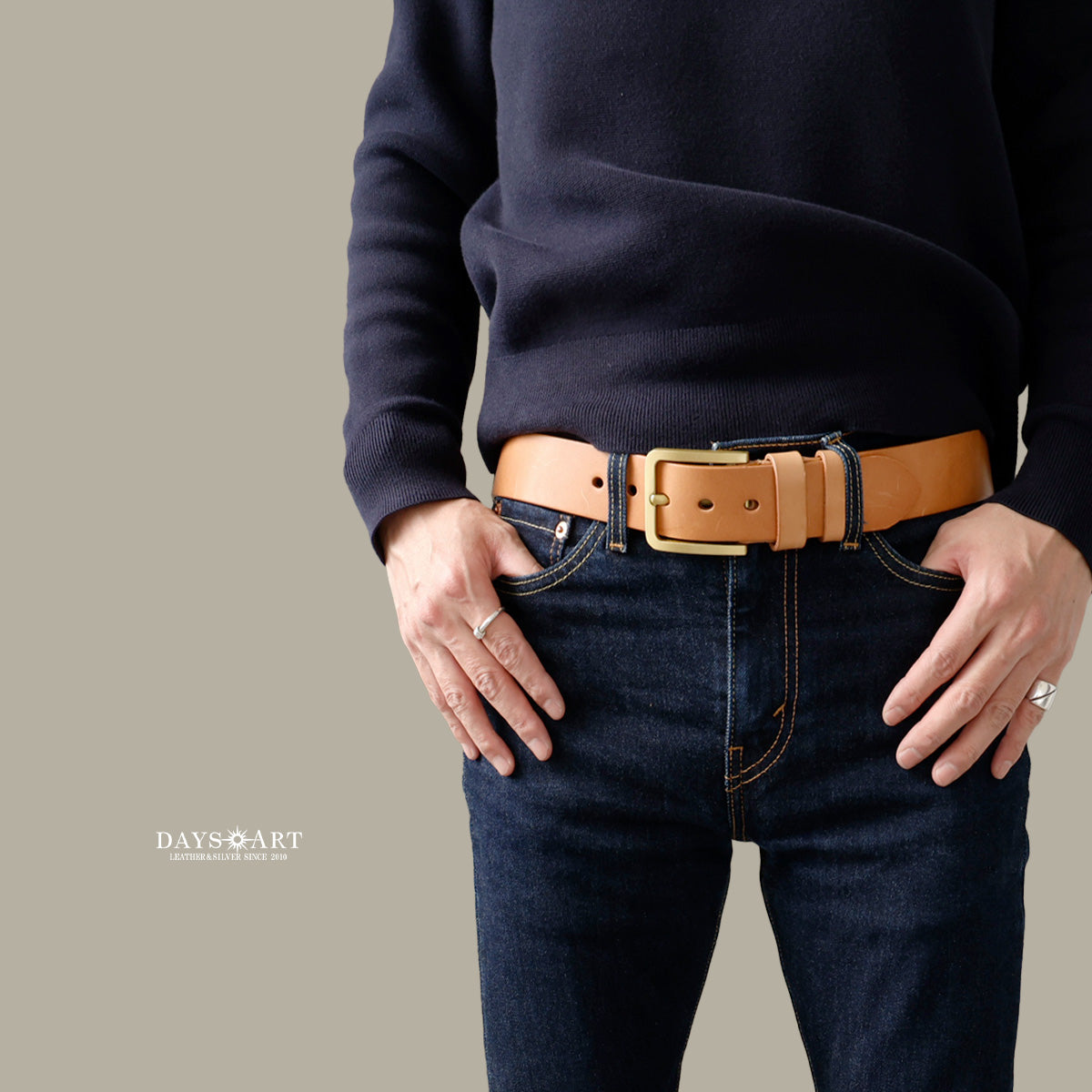 腰元に鈍い黄金色のアクセント。あえて装飾を削ぎ落としたスクエアバックルは、無垢の真鍮(ソリッドブラス)製です。4ミリ厚のタフなレザーを受け止める強固な造りでありながら、その佇まいは至極スマート。特筆すべきは、革と共に歩む「金属の経年変化」です。使い込むほどに光沢が落ち着き、重厚なアンティーク調の渋みへと変化する様は圧巻。細部に宿るヴィンテージを完成させます。
